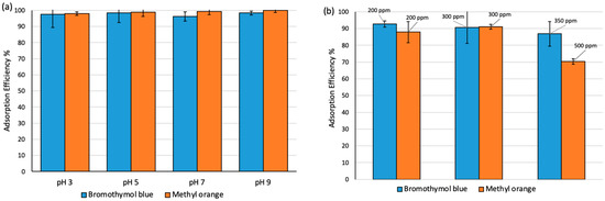 (a) Effect of pH on the extraction efficiency of MO and BT by Fe3O4-MSNs-PMETAC (contact time 3 h at 25 °C and concentration is 100 ppm). (b) Adsorption Efficiency (%) at different concentrations 200, 300, 350 and 500 ppm by Fe3O4-MSNs-PMETAC (pH = 7 and 80 min at 25 °C).