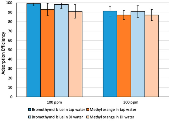 Adsorption efficiency (%) of methyl orange and bromothymol blue dyes using different water types.