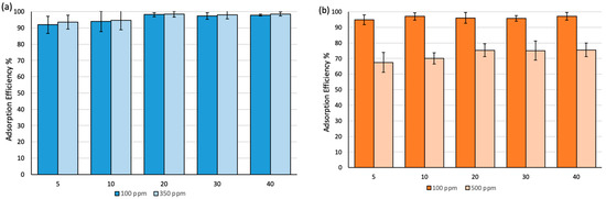 The effect of time variation on the adsorption efficiency has been studied over a 40 min time frame at different concentrations, as shown in Figure 6. The efficiency was ca. 90% in 5 min after exposure time at 100 ppm and 350 ppm of BT and reached equilibrium after 20 min of exposure time with almost 98% removal efficiency. Similar behavior was observed when MO was used (Figure 6b). However, the removal efficiency decreased to ~70% at 500 ppm.