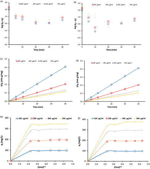 where qt is the adsorption capacity in mg/g at time t. The rate coefficients of pseudo first-order and pseudo second-order, respectively, are K1 (L/min) and K2 (g/mg·min).