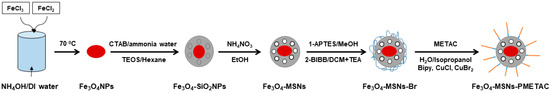 Iron oxide nanoparticles (Fe3O4 NPs) were fabricated by mixing ferrous and ferric salts in basic media. The mixture was heated to 70 °C for 20 min to complete the reduction reaction. The Fe3O4 NPs were then coated with mesoporous silica shell using the Stöber method in the presence of expander agent (hexane) to increase the pore size. After removing the template using an ionic exchange method, Fe3O4-MSNs had been coated with thin layer of organic molecules terminated amine group (APTES). BIBB molecules have been used to react with amine groups, producing Fe3O4-MSNs capped with ATRP initiator. Magnetic mesoporous nanoparticles were modified with cationic polymer brush (poly(2-(methacryloyloxy)ethyl] trimethylammonium chloride solution) using ATRP technique, as shown in Scheme 1.