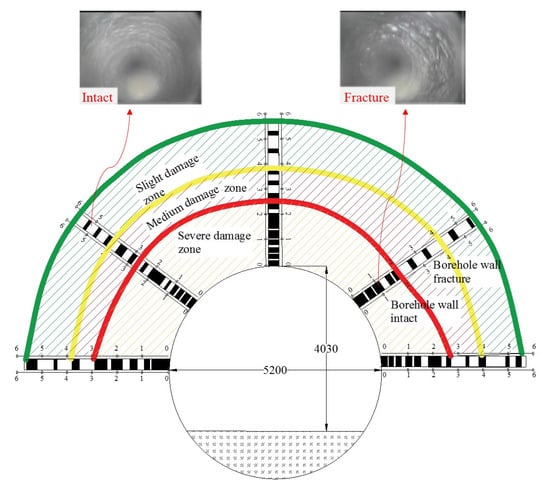According to the basic geological conditions of the 74,104 working face in the Zhangshuanglou Coal Mine, the relevant parameters are put into the Formula (7). The damaged boundary line (red line) around the borehole under the different diameters (blue line) can be calculated as shown in Figure 3.
