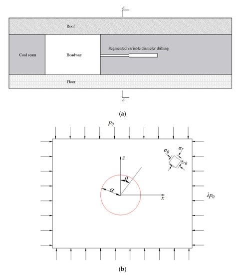 Assuming that the surrounding rock mass is homogeneous and isotropic, the borehole section is round, and the burial depth and axial length are large enough. According to the superposition principle in elastic mechanics, the load is decomposed into the sum of the uniform pressure and the uniform pressure . When the four sides are uniformly distributed pressure , the stress component equation of the borehole surrounding rock in polar coordinates is []: