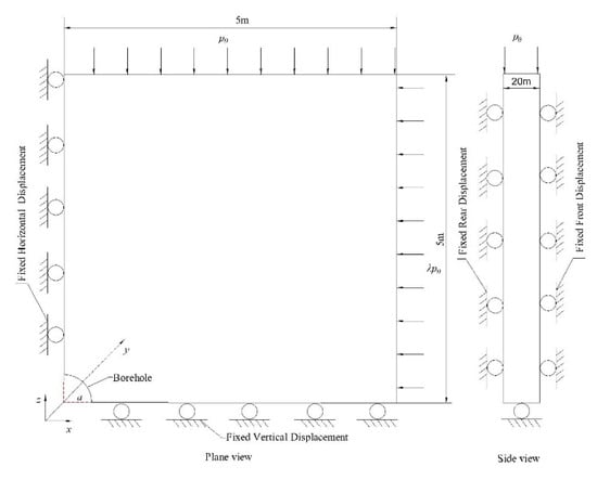 The FLAC3D numerical simulation software was selected to study the effect of the borehole diameter on the pressure relief effect. Since the borehole model is axisymmetric, in order to simplify the calculation, a 1/4 model is used. Under the same other conditions, the borehole diameters were taken as 120 mm, 150 mm, 180 mm, and 200 mm, respectively. The size of the model is 5 m × 5 m × 20 m. The vertical loads and horizontal are applied to the upper and right sides, respectively, and the y displacement constraints are applied to the front and rear sides, the x displacement constraints are applied to the left sides, and the z displacement constraints are applied to the lower sides. The holes of different diameters are drilled in the middle. The schematic diagram of the force and constraints on the boundary of the model is shown in Figure 7. The Mohr–Coulomb yield criterion was used during the simulation. The specific model parameters are shown in Table 2.