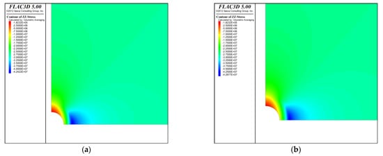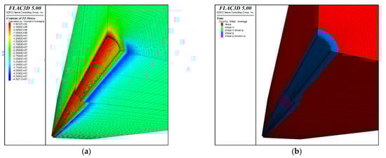 The diameter of the borehole is selected from 100 mm to be drilled at a depth of 3 m, and then expanded to 200 mm and drilled at a depth of 20 m. The distribution of the stress and plastic zone around the borehole is shown in Figure 10.