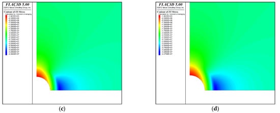Stress distribution of rock mass with different borehole diameters. (a) 120 mm; (b) 150 mm; (c) 180 mm; (d) 200 mm.