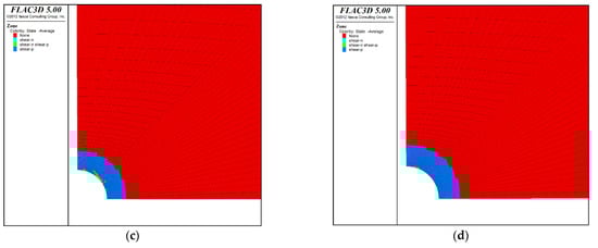 When pressure relief drilling is performed in the coal body, the coal body around the borehole will rupture under the action of stress, resulting in a certain plastic region. The larger the plastic zone, the better the drilling pressure relief effect []. It can be seen from the analysis in Figure 9 that with the continuous increase in the borehole diameter, the area where the shear failure occurs becomes larger and larger. Larger bore diameters create more plastic failure zones inside the media, allowing for full impact pressure loads. The literature [] analyzed the pressure relief effect when the borehole diameter was 60 mm, 80 mm, 100 mm, 120 mm, and 140 mm, and also pointed out that with the increase in the borehole diameter, the pressure relief effect is better.