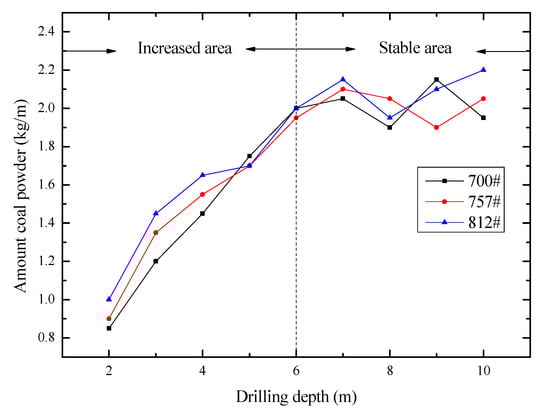 As the drill pipe drills the coal and rock mass, the drilling depth increases and the mining stress also gradually increases. The increase in the mining stress leads to the increase in the deformation of the coal body, and the larger hole diameter per unit volume causes the drill pipe to jump slightly, thereby leading to an increase in the amount of drill cuttings []. It can also be seen from Figure 11 that, with the increase in the drilling depth, the amount of pulverized coal gradually increases. When the drilling depth is 0 m−6 m, the amount of pulverized coal increases sharply. When the drilling depth is 6 m−10 m, the drilling pulverized coal quantity is stable. The literature [] gives the critical value of the amount of pulverized coal in drilling, and when the maximum amount of pulverized drilling is less than 3 kg/m, there is no risk of impact. It can be seen that the amount of pulverized coal in all of the drilled holes is less than 3 kg/m, indicating that the effect of reducing the pressure relief is obvious. In addition, there are no dynamic phenomena, such as sticking, during the construction of the check hole.