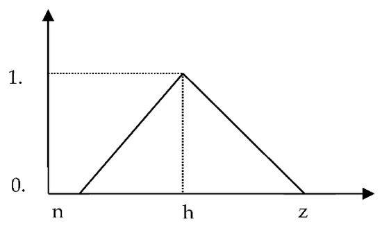 Zadeh (1965) [23] created fuzzy set theory. There are numerous types of fuzzy numbers available nowadays; triangular fuzzy numbers are used in this study due to their efficiency and convenience of usage [24,25,26,27,28]. Figure 4 depicts how it is defined.