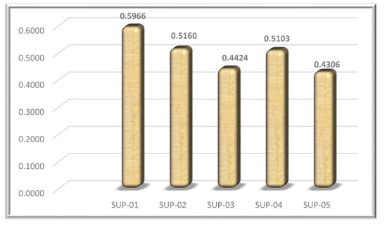 The authors suggested a fuzzy multicriteria decision making model, incorporating a fuzzy AHP and TOPSIS model, in this study to construct a decision support system in the selection of plastics raw material suppliers. In the initial step, a fuzzy AHP was used to establish the weight of all criteria, and the TOPSIS model was then utilized in the last stage to rank all probable plastics raw materials suppliers. The top three plastics raw material providers, as shown in Table 5 and Figure 5, were SUP-01, SUP-02, and SUP-04, with scores of 0.5966, 0.5160, and 0.5103, respectively. As a result, supplier 01 (SUP-01) is the best choice.