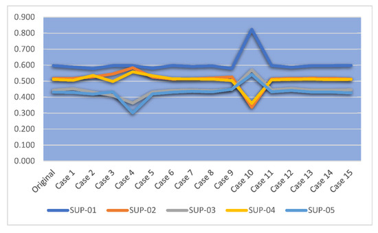 From Table 7 and Figure 6, the performance of Alternative 1 (SUP-01) is consistently the best. This suggests that, while there are some changes in the ranking of other alternatives, Alternative 1 performs well across all cases and the result of the proposed approach is robust.