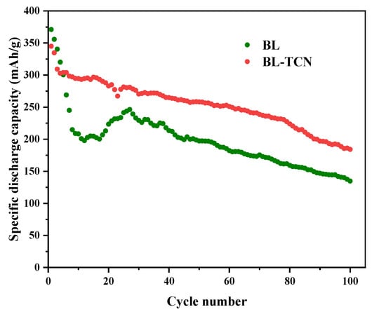 The batteries with various electrolyte formulations were cycled three times at 0.1 C and subsequently 100 times at 0.2 C to produce the capacity attenuation curve depicted in Figure 1, which was used to study the cycle performance of the cells. Both batteries showed fast capacity deterioration, but the capacity fading of the battery containing TCN was significantly slower than that of the BL electrolyte, showing better cycle stability. From the initial cycles, the capacity decay of the BL group began to slow after three cycles, indicating that the SEI film formed after the third charge and discharge. However, the capacity fading of the BL-TCN group began to slow after ten cycles, which showed that the building of the SEI layer in the standard electrolyte was slow and that the addition of the TCN had a favorable impact on the formation of the SEI layer. Figure 2 shows the CV test results for the first three cycles of different electrolytes, which show an enormous difference. In Figure 2b, during the first cycle of the discharge process, a reduction peak was seen at about 1.47 V, which was not seen in the blank samples, indicating that TCN may have decomposed and formed an SEI layer [].