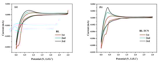 CV curves of Li/SiO@C half-cells at a scan rate of 0.001 V/s: (a) BL; (b) BL-TCN.