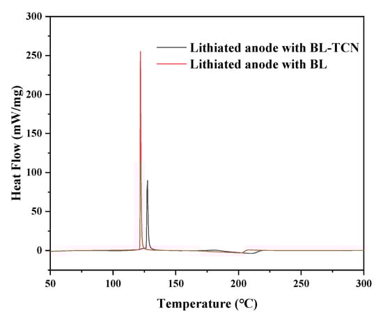 Given the thermal danger associated with the cohabitation of a lithiated anode and an electrolyte, the calorimetry method must be used to determine the essential thermoki-netic parameters for assessing thermal risk [,]. Figure 4 shows the DSC test results of the mixture of lithiated anode powder and electrolyte at a heating rate of 6 °C/min. The DSC curves of the two groups of samples showed significant exothermic peaks, and the lithiated anode with the BL electrolyte was used as the blank control group: the onset temperature (To) was 122.22 °C, the peak value of temperature (Tp) was 132.25 °C, and the heat of reaction (ΔH) was 240.48 J/g. When TCN was added into the electrolyte, the To and Tp of the mixture of anode and electrolyte increased to 127.07 °C and 133.52 °C, respectively, and the heat of reaction (ΔH) reduced to 151.71 J/g.