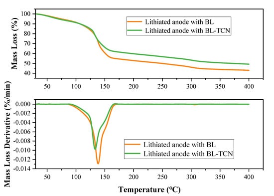 The mass loss of the sample without the additive was 56.93%, while the mass loss of the sample with the additive TCN was decreased to 49.98% when comparing the two sets of data with different electrolytes. The reaction of the lithiated anode with the BL-TCN electrolyte was slower and the reaction time was shorter, particularly in the third stage of mass loss. The TG results showed that additive TCN positively inhibited the exothermic reaction between the lithiated anode and electrolyte, which was consistent with the DSC results.