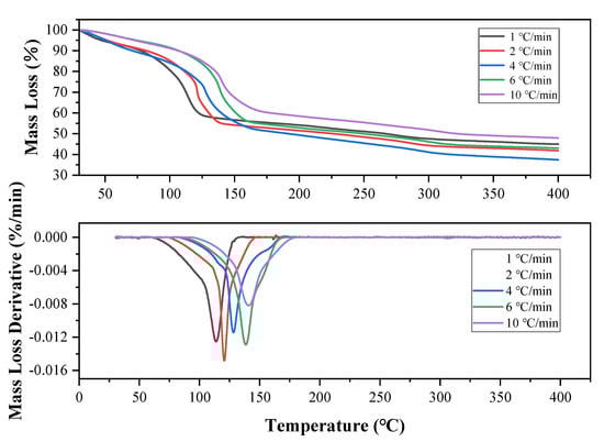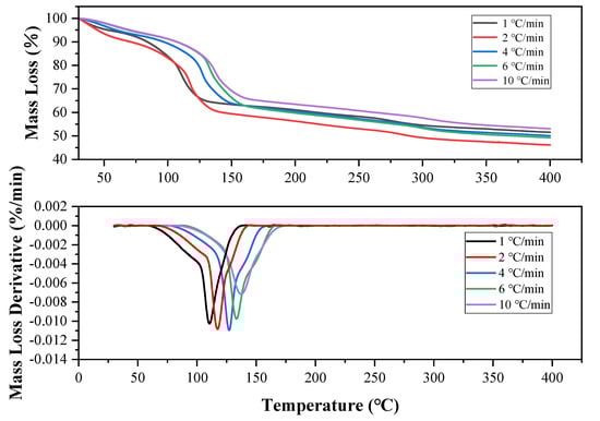 TGA was used to test the relationship between sample mass loss and temperature change during heating []. The fresh and unwashed lithiated anode powder was used as the TGA test object to observe its mass loss. The test process was carried out in a nitrogen atmosphere, and the sample mass was about 10 mg. Five tests were carried out at heating rates of 1, 2, 4, 6, and 10 °C/min [,].