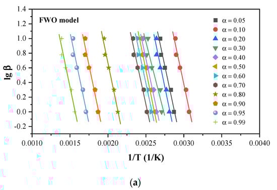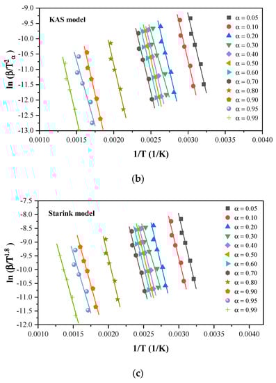 Calculating Ea using thermokinetic models is a reliable way to assess the safety of substances. An equal approach was used to calculate the thermokinetic parameters of the anode and electrolyte under different thermokinetic models (KAS, Starink, and FWO) based on the thermokinetic data from TGA. Comparing the Ea values calculated using various methodologies improved the reliability of the findings []. Three different sets of fitting results are obtained using kinetic models. Each set of fitting results contain multiple fitted lines under various α, and Ea can be calculated according to the slope of the fitted lines. For example, in the KAS model, there is a linear relationship between ln (β/Tα2) and 1/T, and the slope of their fitting line determines the Ea value.
