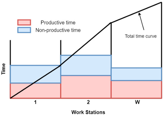 Lastly, time optimization is one of the central themes in RMS literature [2]. The workstations can perform the tasks assigned to them, and each task can be performed by either a human or automated agents (robots, AGVs, etc.). A workstation with the maximum processing time/working time is the bottleneck workstation and can reduce the line efficiency [5]. Such workstations are the weakest link in the chain and require more effort for improving the overall efficiency of a production system. Eswaramoorthi et al. (2012) [20] highlighted that the unequal distribution of workload creates imbalance and enhances the risk of ergonomics. The unequal distribution of workload reduces the lifetime of machines and increases the chances of a breakdown. As a reconfigurable system is an expensive manufacturing paradigm, it is imperative to ensure the equal distribution of workload for the prolonged life of this manufacturing system.