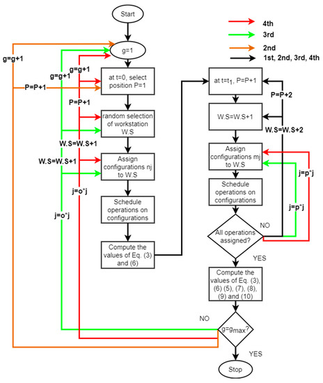 The base model solutions are attained by randomly assigning configurations to workstations and then scheduling operations on these configurations. These solutions are archived at the end of generations. The consolidated framework of all four assessments is given in Figure 4. The black arrows refer to the steps involved in executing the no repositioning strategy or the common steps among all four assessments. Separate color codes are used to designate the steps of the remaining assessments. The base model is based on the no-repositioning strategy as the position of workstations and configurations are not changed and they are considered as given by the initial solution. A workstation is mounted at each position of the manufacturing system, configurations are assigned to the workstation, and operations are scheduled on such configurations. The algorithmic steps of the no repositioning strategy are provided below: