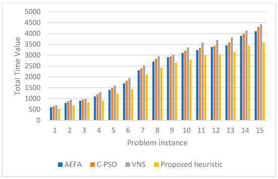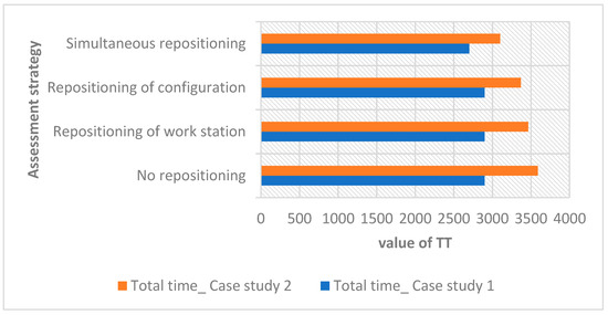 The four variants/assessments of the heuristic were separately implemented to understand their effectiveness in case study 1 and case study 2. The Total Time (TT) values for both case studies using different assessments are provided in Figure 18. Case study 2 findings show a substantial reduction in the total time value, as the assessment is changed from no-repositioning to the simultaneous repositioning of workstations and configurations. The TT value of case study 1 shows the only improvement in the simultaneous repositioning strategy. Thus, the precedence order (case study 1) puts a constraint/limit on the possible reconfiguration/arrangement of configurations and workstations.