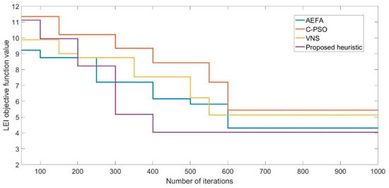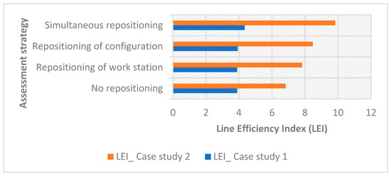 The objective function values of the line efficiency index for both case studies in different assessment strategies are provided in Figure 19. A similar trend can be observed in these results, i.e., case study 2 findings provide a substantial increase in the line efficiency index. On the other hand, a static behavior is shown by case study 1 results, where only marginal improvement in the line efficiency index value is observed with both configurations, and workstations are simultaneously repositioned.