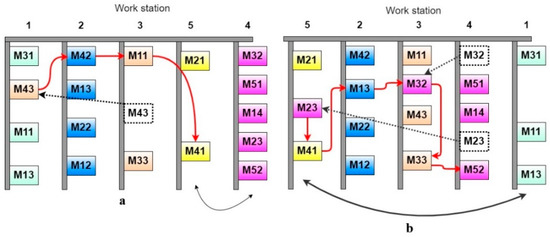 Comparatively, solution (a) in Figure 15 shows that not only is configuration M43 shifted to the 1st workstation, but workstations 4 and 5 are swapped to achieve better results. The reason behind no swapping of workstations in case study 1 is because of the ordering of operations in case study 1 which does not allow any repositioning if the precedence constraint is violated. Once the operational constraint is upheld, the system will look for all possible re-arrangements of configurations and workstations to achieve optimality.