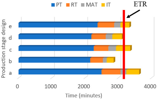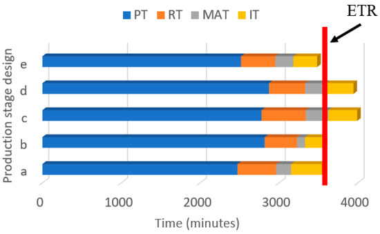 The breakdown of time components into Production Time (PT), Reconfiguration Time (RT), Module Adjustment Time (MAT), and Idle Time (IT) is provided in Figure 16 (case study 1) and Figure 17 (case study 2). For an ETR value of 3200 min (50 units required), only one solution (b) of case study 1 can respect the customer’s preferred time of delivery. On the other hand, for an ETR value of 3500 min, one solution (e) satisfies the customer preferred delivery time, and two other solutions (a and b) fall on the borderline.