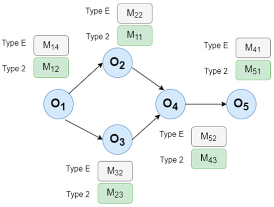 The earlier presented model was based on multiple objectives i.e., it considered the objectives of the Total Time (TT), the Line Efficiency Index (LEI), and the Customer Satisfaction Index (CSI). The TT value referred to the Type 2 problem, whereas the LEI value referred to the Type E problem. In this sub-section, the mono-objective functions of the TT and the LEI are considered, leading to the separate analysis of Type 2 and Type E problems, respectively. The configuration selection for the operations of case study 1 for both problem types is provided in Figure 20. Configurations M12 and M14 can be used for processing the first operation (O1) for the optimal values of Type 2 and Type E problems, respectively. These results can help to avoid the conflict of choosing a solution in a multi-objective environment.