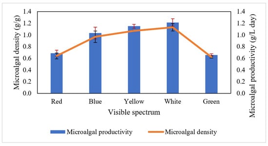 Productivity and density of attached microalgae on palm decanter cake at various visible spectra of irradiation.