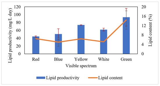 The impact of various visible spectra on the attached microalgal biomass could be further comprehended from the perspective of lipid content and productivity, since lipids are the most important biochemical for the microalgae’s downstream processes (Figure 2). Among the five spectra, attached microalgal cultivation under green light had the highest lipid content (14.341 ± 0.14 %) and lipid productivity (93.428 ± 0.18 mg/L per day). In this context, the microalgae favored lipid production and accumulation over growth, as shown by the lowest microalgal density and productivity being found under green light irradiation (Figure 1). This primarily stemmed from the green light being reflected the most, which subjected the microalgal cells to light limitation stress []. Accordingly, the microalgae received an inadequate level of photon fluxes for cell growth, thus, inducing the lipid to be stored instead of using them as energy for microalgal cell proliferation. Similar trends were observed for Chlorella vulgaris and Ettlia pseudoalveolaris, which both had higher lipid contents when cultivated at intensities of 50 and 150 μE/m2 per s, respectively, as opposed to a higher light intensity []. Moreover, Chen et al. [] confirmed that Chromochloris zongfingienis under continuous dark cycle cultivation had yielded more lipids than continuous light cycle growth. In fact, any stress that inhibits microalgal growth could convert additional carbon and energy into lipid storage by the cells, predominantly in the form of triacyclglycerols, which are effectively packed in the cells and provide energy for oxidation, thus forming the best reserves for cell reconstruction after the stress condition was removed []. On the contrary, red spectrum cultivation accumulated the least lipid productivity due to rapid detachment of the microalgal biomass from the palm decanter cake, which was thus lost to the suspended growth form []. However, the lipid content of the attached microalgae under red light cultivation was slightly higher than that of blue, yellow, and white light. The rationale for this was a deficiency in the red light’s intensity, as it was unable to penetrate into the culture medium and thus triggered light limitation stress, improving the lipid accumulation of the remaining microalgal cells growing on palm decanter cake.