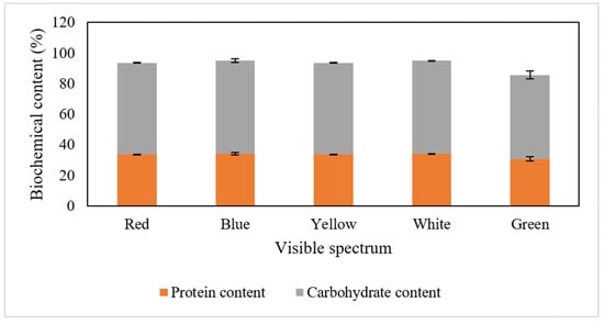 Apart from the attached microalgal lipids, other cellular biochemicals, including carbohydrate and protein, were also affected by changes in the visible spectra. Microalgal carbohydrates can serve as a source of bio-alcohols, such as bioethanol and biobutanol []. On the other hand, protein from microalgal feedstocks can be extracted for bio-oil, animal feed, medicine, and pigment production []. Figure 3 depicts the protein and carbohydrate contents of attached microalgae upon having been exposed to various visible spectra of irradiation. The blue and white light imparted the greatest protein content enhancement (0.341 g/L), and microalgae under white light accumulated the highest carbohydrate content of 0.919 g/L. This trend was inversely proportional to the lipid accumulation (Figure 2), implying that less of the photosynthetic flow of carbon and energy from protein and carbohydrate was converted into the biosynthesis of lipids. Moreover, this could also engender the highest nitrogen uptake from palm decanter cake for conversion into protein, and the highest carbon dioxide assimilation for protein as well as carbohydrate production within microalgal cells. Conversely, green light cultivation accumulated the least protein and carbohydrate content, amounting to only 0.307 and 0.806 g/L, respectively. In this case, the lipids were a better energy reserve than carbohydrate under green light irradiation, i.e., approximately 2.25 times higher in energy value than carbohydrate. Thus, it was shown that green light could trigger the microalgae to build an efficient energy and carbon storage system as opposed to other visible irradiation spectra, offering the greatest sink for available energy accumulation [].