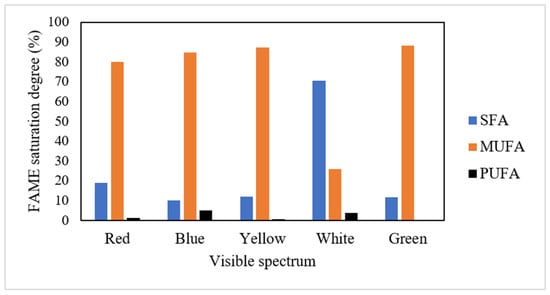 Biodiesel, one of the major biofuels produced from microalgal lipid feedstock as a substitute for non-renewable fossil fuel, comprises numerous categories and varieties of fatty acid methyl esters (FAME), which will dictate the quality of the biodiesel. As demonstrated in Figure 4, each visible spectrum for cultivating microalgal biomasses had the highest composition of monounsaturated fatty acids (MUFA), except for white light cultivation, which had the highest content of saturated fatty acids (SFAs) (70.38%). This was possibly a result of the high consumption of MUFAs for microalgal metabolism and growth (Figure 1). MUFAs have a single double bond that is more easily broken down than SFAs, which do not have any double bonds in releasing the energy. On the other hand, PUFAs have been reported to be susceptible to oxidative damage from the presence of reactive oxidative species []. The increases in SFAs and PUFAs were proportional to the wavelength of the visible spectrum, implying that the photo-enzymes in the microalgal species were activated by the longer light wavelengths and synthesized more fatty acids, particularly SFAs [,]. Less of the excitation energy would be absorbed by the cells to impede photodamage on the acceptors of Photosystem II. Nevertheless, the highest percentage of PUFAs was observed under blue light cultivation as a response to the microalgal enzymes in the cells. It was also discovered that white light produced the lowest biomass (Figure 1) but produced highest SFA and lowest MUFA + PUFA grade biodiesel (Figure 4). This could be because irradiation under white light triggered the stimulation of the photoreceptors, boosting the chlorophyll density and resulting in higher growth. It has also been mentioned in the literature that photochromic stress may sometimes lead to changes in the photosystems, thereby affecting the ultrastructure of the thylakoid organelles in microalgal cells and thus affecting the biodiesel profile [].