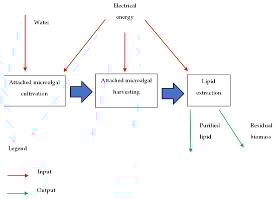 The evaluation of the net energy by life cycle analysis (LCA) encompassed the microalgal lipid production process, with the proposed flow diagram depicted in Figure 5. The functional unit was assigned as 1 g of lipid extracted from the attached microalgal biomass. Simapro® 8.4.0 was chosen to compute the energy requirements of each process. In microalgal cultivation, water, nutrient, light, and energy inputs were the primary starting concerns for biodiesel production from lab scale to pilot and industrial setups []. Figure 6 demonstrates that yellow and white light required the least electricity (0.324 kWh), while green light demanded the smallest amount of water (859.6 g) to produce 1 g of microalgal lipid. This was also supported by the highest lipid content being recorded under green light cultivation (Figure 2). The reduced water usage during cultivation would lead to a lower cost of microalgal dewatering, while minimizing the subsequent wastewater production. Compared with yellow light, which required more water to cultivate the attached microalgae (902.663 g), green light saved an additional 43.064 g of water per 1 g of lipid produced. Since yellow light cultivation led to the highest lipid yield per energy input, the list of energy demands of various processes to yield 1 g of lipid from attached microalgal cultivation is shown in Table 6. In this regard, a net energy input of 115.72 MJ was needed, of which 110.47 MJ (95.46%) stemmed from non-renewable fossil fuels due to the intensive electricity usage. However, the use of palm decanter cake was not incorporated in this assessment, because it was retrieved as a waste by-product to serve a dual role, namely, a platform and nutritional source for the attached microalgal. Leong et al. [] claimed that the energy equivalent of 1 g of lipid is 35 MJ.