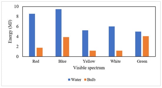 Energy inputs of water and light for growing attached microalgae on palm decanter cake at various visible spectra of irradiation.