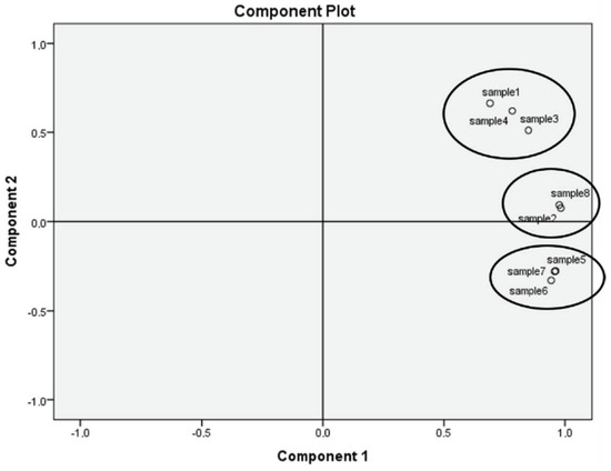 A principal components analysis (PCA) was conducted, and it is shown in Figure 1. The values of all determined parameters of medlar jam produced at different temperatures and technologies were used to create Figure 1. The PCA revealed three clusters (according to Eigen value): the first cluster (Samples 2 and 8; 83.03% of cumulative variance) contained medlar jams processed at 100 °C and 60 °C; the second cluster (Samples 5, 6, and 7; 98.73% of cumulative variance), the medlar jams processed at 80 °C and 100 °C; the third cluster (Samples 1, 3, and 4; 99.99% of cumulative variance), the medlar jams processed at 60 °C and 70 °C. It is notable that clusters were formed according to temperature treatments, and differences (p < 0.05) are observable. However, no highly observable differences between sous vide preparation and traditional preparation were observed (Figure 1).