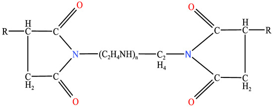 The main chemical involved in this experiment is polyisobutene succinimide (T152), purchased from Wuxi Southern Petroleum Additives Co., Ltd. (Wuxi, Jiangsu, China). Its physical properties include being a brown transparent viscous liquid with dispersible SDT > 55 [15]. T152 emulsifier has good low-temperature dispersion performance and certain high-temperature detergency. Furthermore, it also has the characteristics of good oil solubility, is insoluble in water, is slightly soluble in ethanol, and is non-volatile. Its relative molecular weight is around 800–5000 [16]. Its molecular structural formula is shown in Figure 2.