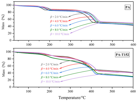 The main experimental method of this experiment was the control experiment method. PA was used as a blank control, as a comparison standard, and PA-T152 was used as an experimental group to compare with PA. Except for the addition of T152, the other conditions of the two samples were the same. The experiment was set up as five groups of experiments with heating rates of 2.0, 4.0, 6.0, 8.0, and 10.0 °C/min, respectively. In order to avoid experimental errors and ensure the same experimental conditions, each group of experiments was repeated three times or more. The measurement procedures for the experiments were all the same.