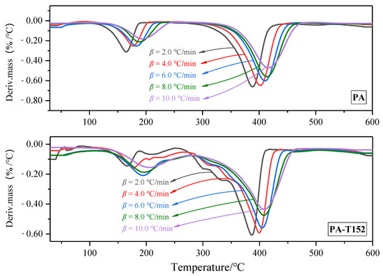 The TG and DTG curves of PA and PA-T152 at different β are shown in Figure 3 and Figure 4. The mass loss process of pure fireworks propellant can be divided into two stages. It can be seen from the figure that T0,s1 of the PA in the first stage occurs at 82.8–100.7 °C. The T0,s2 of the second-stage PA occurs in the temperature range of 233.8–269.2 °C. The reaction time of the thermal mass loss of PA reduces with the growth of β because the mass loss in both stages increases with the increase of β value. The thermal breakdown of components like sulfur in the PA may be the cause of the mass loss in the first step of the diagram. The mass loss in the second stage may be due to thermal decomposition. Figure 4 also shows the results of the mass loss derivative of fireworks propellant as a function of temperature at different β.