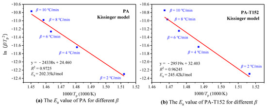According to Equation (4), the Kissinger method was used for the linear fitting of PA and PA-T152, and the results were displayed in Figure 6. In Figure 6a, the slope of the line after fitting ln (β/Tp2) and 1000/Tp is −24,338.38. Therefore, according to the slope calculation, the Ea of PA is 202.35 kJ/mol. Similarly, the slope of the line after fitting in Figure 6b is −29,518.78, and the Ea value of PA-T152 can be calculated as 245.42 kJ/mol. Therefore, the values of the linear fit accuracy R2 of the two lines are 0.9725 and 0.9624, respectively, which is close to 1, indicating that both sample models have a better fit.