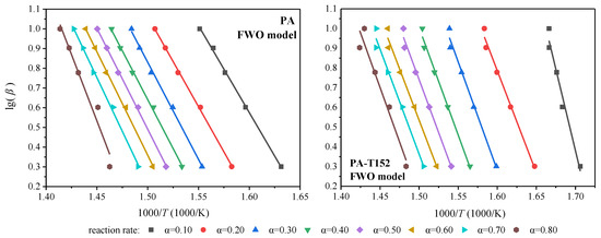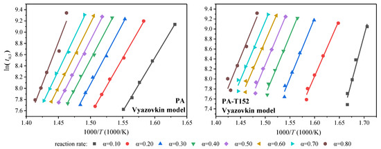 In Figure 7, the average Ea and R2 of PA calculated by FWO are 184.40 kJ/mol and 0.9938, respectively; the average Ea and R2 of PA-T152 calculated by FWO are 203.96 kJ/mol and 0.9810. In Figure 8, the average Ea and R2 of PA calculated by Vyazovkin method are 183.96 kJ/mol and 0.9933, respectively; the average Ea and R2 of PA-T152 calculated by Vyazovkin method are 204.55 kJ/mol and 0.9791. Ea and R2 values of PA-T152 obtained through the other methods are shown in Table 2 and Table 3.