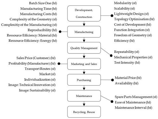 The various categories are linked to technological as well as economic aspects, and include sub-steps—so-called criteria. The technological aspects can be very product-specific, such as lightweight construction or mechanical properties [36,42,43]. Economic aspects can be related to the profitability of the product, such as the return on investment or the sales price [44,45,46]. In the category of development and construction, the product is developed and designed. Classical and modern development strategies and processes are applied. The shape and characteristics of the product are determined; prototypes are also produced, and tests are carried out. A digital product is also created in terms of a digital twin and in the sense of the Internet of things (IoT) and Industry 4.0. In the manufacturing category, the product is assigned to the most appropriate machines in terms of objectives and characteristics. For quality control, the monitoring and inspection criteria of the product are defined from production to delivery. Rejection rates and inspection criteria are assigned based on the manufacturing processes, the area of application, and the product series. The marketing and sales category includes sales price (customers’ view), profitability (manufacturers’ view), transport routes, marketing, individualisation, and technological and sustainable image. Purchasing is strongly dependent on the availability of materials and the resulting price structures. In the maintenance category, product-specific measures are considered to extend or reduce maintenance intervals. Recycling and reuse represents the end of the PL. A holistic view of the metal product is essential here—for example, whether the product was operated with toxic or environmentally harmful substances. As the object will be manufactured from the same material within the same framework, the criteria in this category are always of equal importance, and would not influence the decision in the matrix. To reduce complexity, criteria of recycling and reuse are not part of the PL for the present AHP.