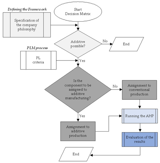 A distinction that considers manufacturing in conventional methods and additive methods is not scientifically and holistically widespread [27,28,29]. According to the literature, the decision-making methods are implemented based on the attributes, criteria, and properties of certain processes or products, as well as problem cases [19]. Classical and well-known methods include, among others, utility analysis, pairwise comparison, the TOPSIS (Technique for Order of Preference by Similarity to Ideal Solution) method, the ANP (analytic network process) method, the VIKOR (VIseKriterijumska Optimizacija Kompromisno Resenje (multi-criteria optimisation and compromise solution)) method, and the AHP method (analytical hierarchy process) [30,31]. Mixtures of evaluation methods can also be found, such as TOPSIS–AHP [25,32].