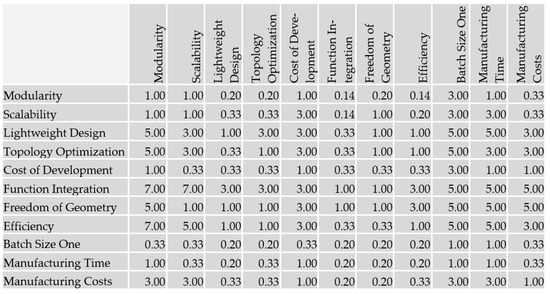 For the subjective pairwise comparison, the weighting of each criterion is described in Table 2. For equal importance, factor 1 is set. In contrast, for extreme importance of one criterion over another, factor 9 is used.