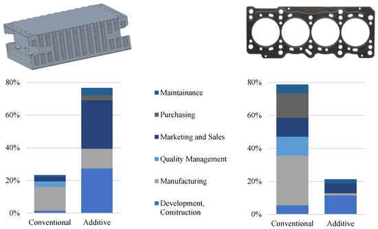 From a manufacturing point of view, conventional production would also be better for the control unit housing. From a holistic point of view, value creation is shifting towards AM. For the control unit housing, the PL categories marketing and sales (29.7%), development and construction (28.8%), and manufacturing (12.1%) were evaluated for AM. In conventional manufacturing, manufacturing (14.7%), quality management (3.3%), and marketing and sales (2.7%) were evaluated. For flat metal gaskets, the calculated categories supporting conventional production are manufacturing (27.5%), marketing and sales (11.1%), and quality management (10.9%). For AM, the categories development and construction (9.7%), marketing and sales (6.8%) and maintenance (2.6%) were identified.