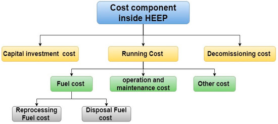The IAEA created HEEP to help US member states in evaluating the techno-economic aspects of hydrogen production. HEEP models hydrogen production in four stages of hydrogen: NPP as the primary energy source, plant for generating hydrogen, and storing and transportation of hydrogen. For each stage, the model requires economic and technical input data for simulation. The program consists of three modules: the first one being the pre-processing module that allows the user to input data; the second module is an executing module that computes the cost of hydrogen from the given input data; and the third is the post-processing module that shows the output after the execution. There are two groups of input parameters: the first is country or region-specific economic data, which is shared by all plants and facilities and includes the fiscal parameters and details for a given period; and the second type of parameter is the facility-dependent parameters, which include information about the technical features and cost components of each facility. HEEP calculates the levelized cost of producing hydrogen by considering various aspects of capital investments that ultimately affect the estimated cost. The investment of capital can be increased at a specific equity-to-debt ratio; i.e., project money can be increased through equities, market loans, or a mixture of both. HEEP calculates the levelized cost of hydrogen generation using Equation (1) [9,31,32,33].