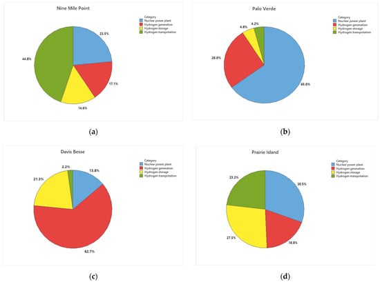Percentage contribution of the nuclear power plant, H2 generation, storage, and transportation cost for (a) shows percentage contribution of H2 generation steps for Nile Mile Point nuclear power plant, (b) shows percentage contribution of H2 generation steps for Palo Verde nuclear power plant (c) shows percentage contribution of H2 generation steps for Davis Besse nuclear power plant and (d) shows percentage contribution of H2 generation steps for Prairie Island nuclear power plant.