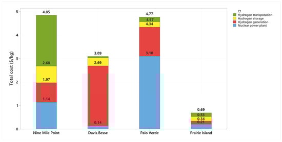 Cost of nuclear hydrogen production from four nuclear facilities in the US.