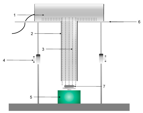 Quasi-parallel beam instrument. 1. Low-pressure UV lamp; 2. Parallel beam cylinder; 3. Quasi-parallel UV light; 4. Adjustable bracket; 5. Magnetic stirrer; 6. Aluminum plate; 7. Petri dish.