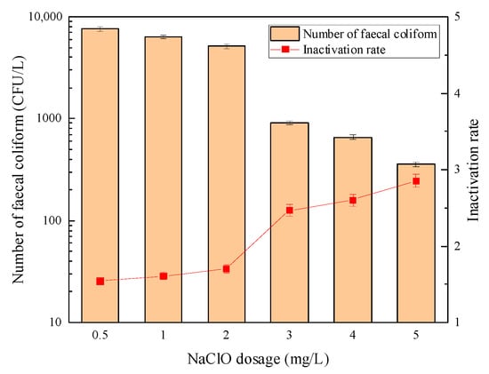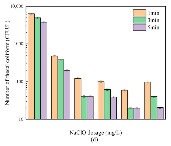 Figure 2 and Figure 3 show the sterilization effects of “Method A” and “Method B”, respectively. It can be seen from Figure 2 that when “Method A” was adopted, under the condition of an ultraviolet dose of 24 mJ/cm2, only 1 mg/L sodium hypochlorite solution was required to be added at a contact reaction time of 1 min. As a result, the number of fecal coliform in the effluent was reduced to 480 CFU/L, meeting the first-Class A discharged standard of “Discharge standard of pollutants for municipal wastewater treatment plant (GB18918-2002)”, thus, 103 CFU/L. However, as shown in Figure 3, when “Method B” was used, the dosage of sodium hypochlorite needed to be increased to 3 mg/L, and the number of fecal Escherichia coli met the provisions of the above standards after disinfection.