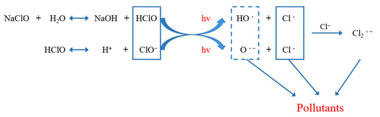 The above experimental results showed that to achieve the ideal disinfection effect when the UV dose was constant, “Method A” significantly reduced the dosage of sodium hypochlorite. Moreover, at the same time, it showed stronger microbial inactivation ability than “Method B”. This was because, during the disinfection process of UV before sodium hypochlorite, UV light caused a certain degree of damage to fecal coliform cells, which improved the possibility that sodium hypochlorite penetrated the cell wall and oxidized the protein or phosphate dehydrogenase inside the cell, to improve the disinfection efficiency. However, when UV and sodium hypochlorite concurrently exists in the water, the hydrolysis products (HClO/ClO−) of sodium hypochlorite produce active oxidation radicals (HO), chlorine atoms (Cl), Cl2·− and O·− under the action of UV photolysis, which was used to degrade the pollutants in water. The reaction process is shown in Figure 4, which is considered a new advanced oxidation process (AOP) [21,22,23,24]. Fang J. et al. [25] believed that the organic matter quickly consumed the strong oxidizing radicals generated by the AOP mentioned above in the secondary effluent, causing it to lose the chance of contact oxidation with microorganisms, thereby resulting in a poor sterilization effect. Therefore, to obtain the ideal disinfection effect, increasing the dosage of sodium hypochlorite is necessary.